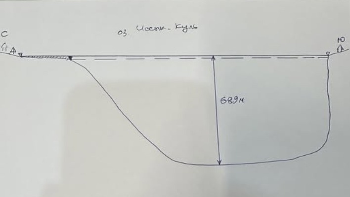 В социальных сетях он опубликовал схематичный рисунок, иллюстрирующий строение дна озера. На схеме горизонтальная линия обозначает поверхность Иссык-Куля. Слева показан северный берег в районе Чолпон-Аты, справа — южный берег в районе села Каджы-Сай. Нижняя изогнутая линия отражает рельеф дна.