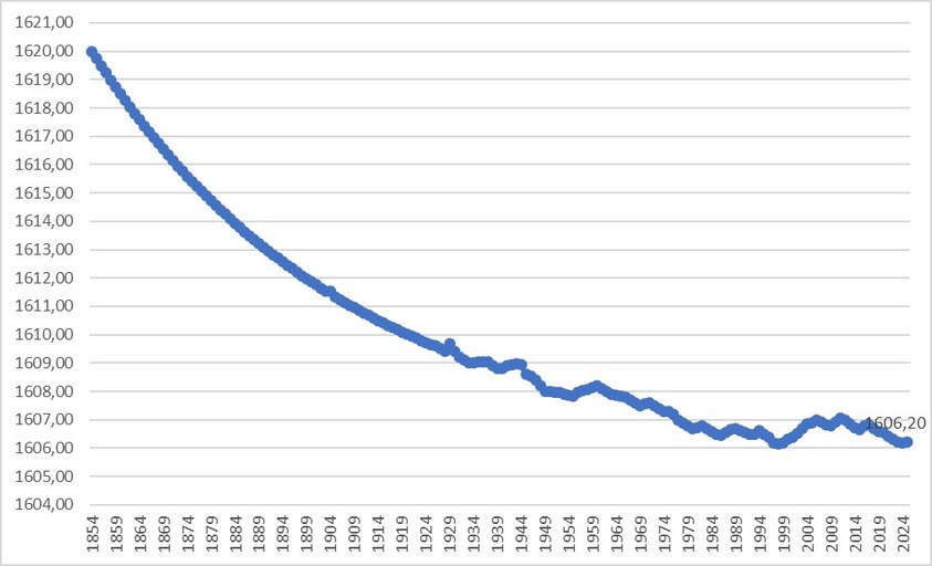Он также приложил график уровня озера с 1854 года до 2024 года. За это время уровень снизился на 13,9 м, но на протяжении последних более 40 лет уровень озера стабилизировался, то есть находится примерно на одном уровне.