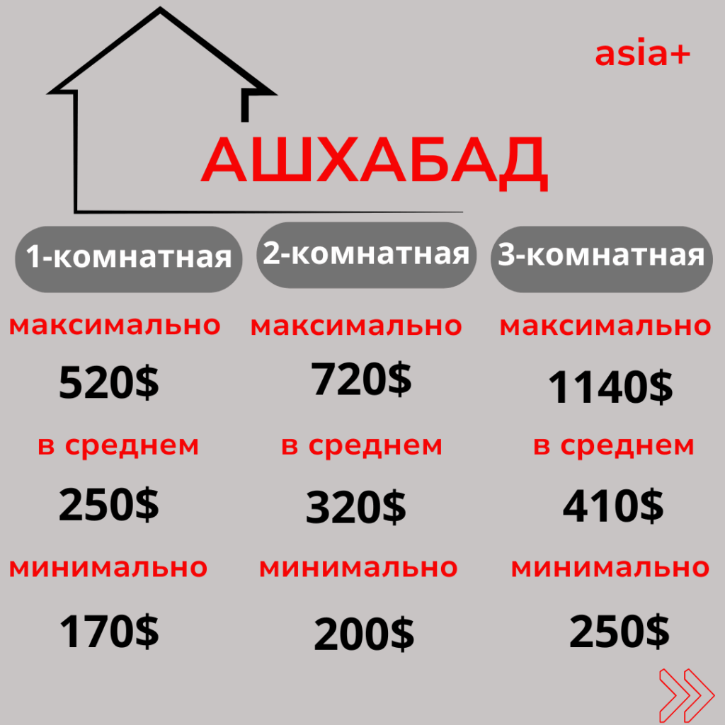 Самые доступные предложения — в Ашхабаде. Здесь однокомнатную квартиру площадью около 40 кв. м с базовой мебелью и техникой можно снять за $250. Двухкомнатная обойдётся примерно в $320, трёхкомнатная — в $410.
