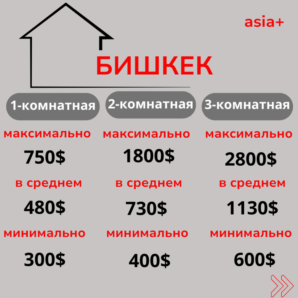 Цены в Бишкеке близки к ташкентским: в среднем $480 за однокомнатную, $730 за двухкомнатную и $1130 за трёхкомнатную квартиру. Итоговая стоимость зависит от площади, состояния жилья и района.