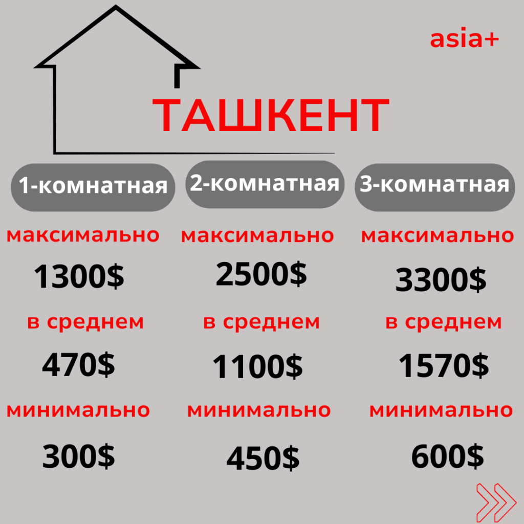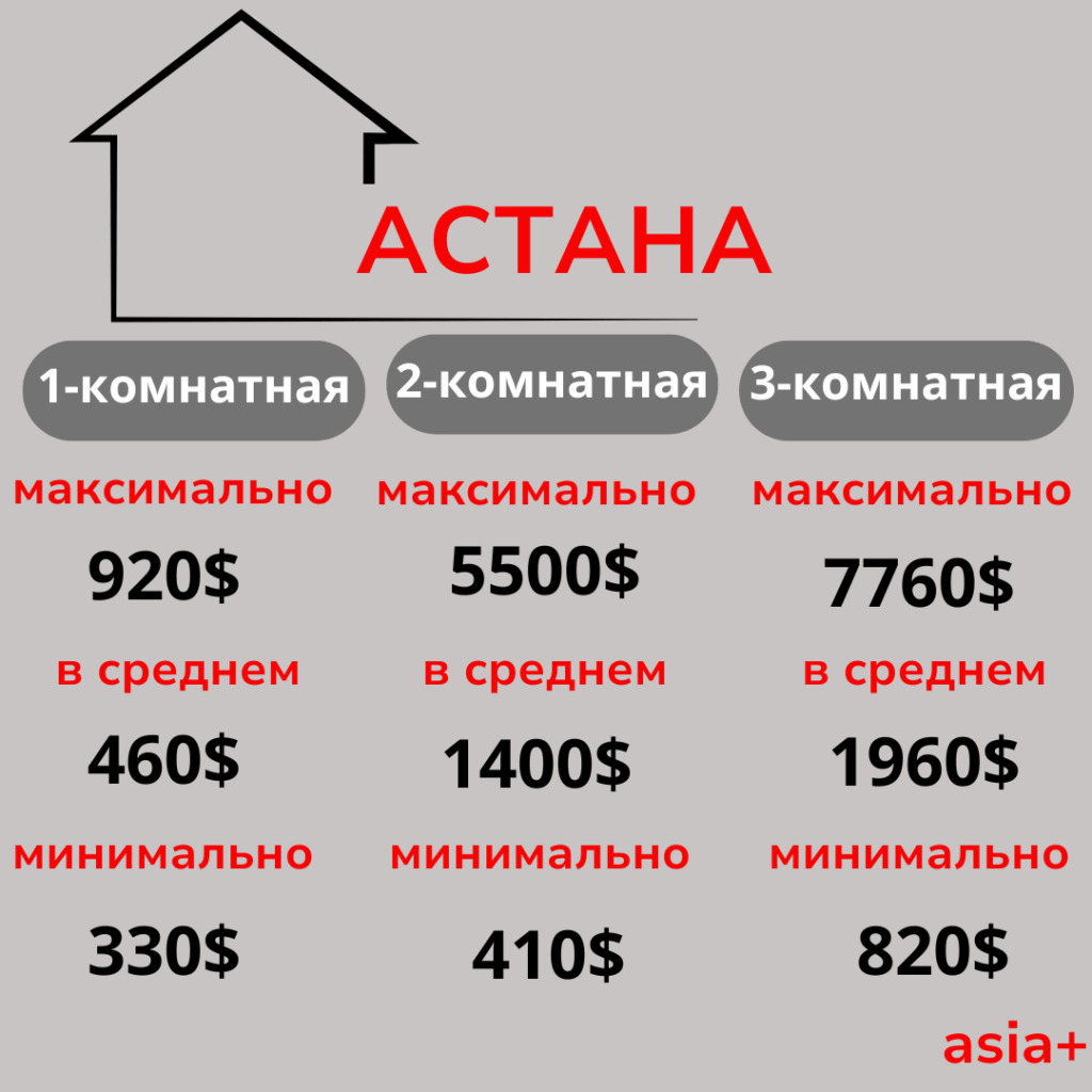 Наиболее дорогая аренда жилья — в Астане и Ташкенте. В этих столицах стоимость однокомнатной квартиры варьируется от $470 до $920 в месяц, двухкомнатной — от $1100 до $1400, а трёхкомнатной — от $1570 до $1960.