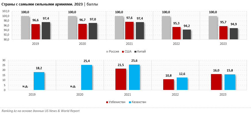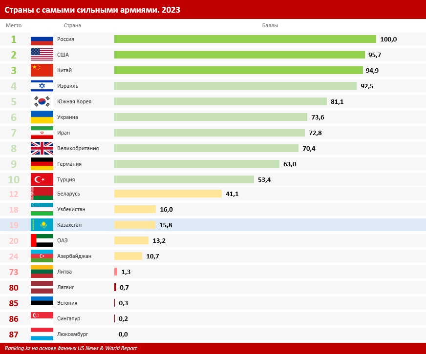 Между тем, Казахстан занял 19-е место среди 87 стран в рейтинге силы армий по версии News & World Report, расположившись между Узбекистаном (18-е место) и ОАЭ (20-е место). Для сравнения: Беларусь оказалась на 12-й позиции, Азербайджан — на 24-й. Этот показатель является одним из шести атрибутов, которые формируют общий индекс могущества государств.