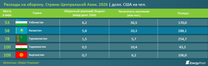 В 2026 году Казахстан стал лидером Центральной Азии по военным расходам в расчёте на одного жителя — 288 долларов в год. Об этом сообщает EnergyProm. В глобальном рейтинге по этому показателю впереди Израиль и США.