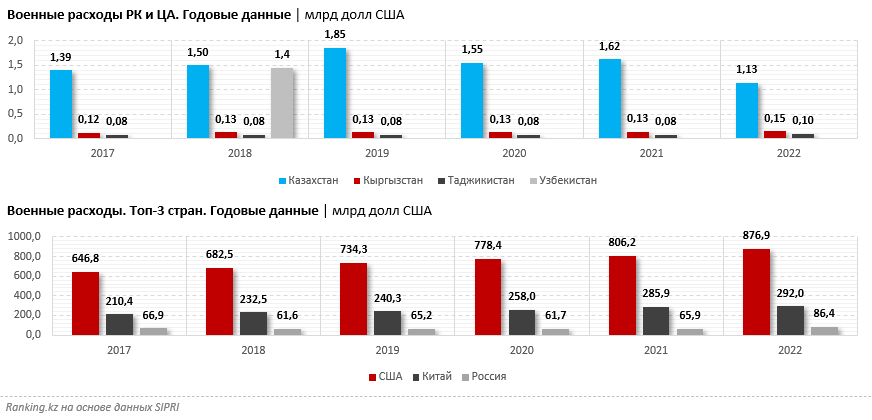 По данным SIPRI, Казахстан располагает крупнейшим военным бюджетом среди стран Центральной Азии, предоставивших данные: в 2022 году он достиг 1,1 млрд долларов. Для сравнения, военные расходы Кыргызстана составили 149,8 млн долларов, Таджикистана — 103,5 млн. Согласно данным inbusiness.kz, Казахстан планирует увеличить оборонные расходы до 1,2 трлн тенге (около 2,4 млрд долларов по текущему курсу).