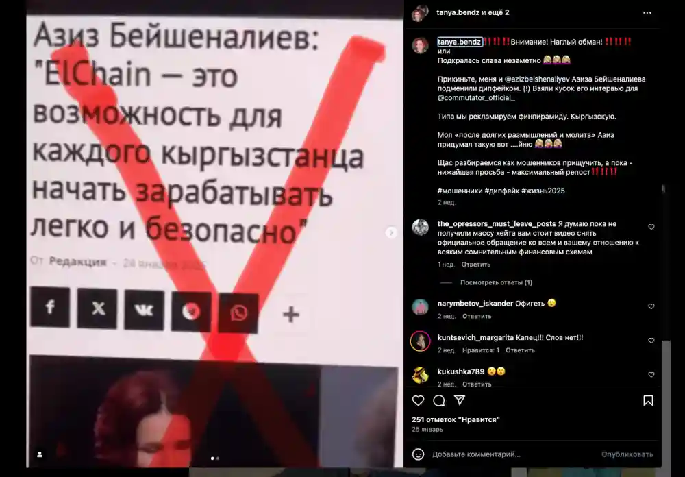«Используя данные публичных личностей, мошенники создают видимость, что их проекты безопасны и выгодны. Ну а у рекламы с медиаперсонами больше охватов, даже если сами эти персоны и не знали, что их лица где-то использовались», — прокомментировали в кыргызстанском сообществе IT-специалистов ATLANTS, которое объединило экспертов для защиты граждан от кибермошенничества.