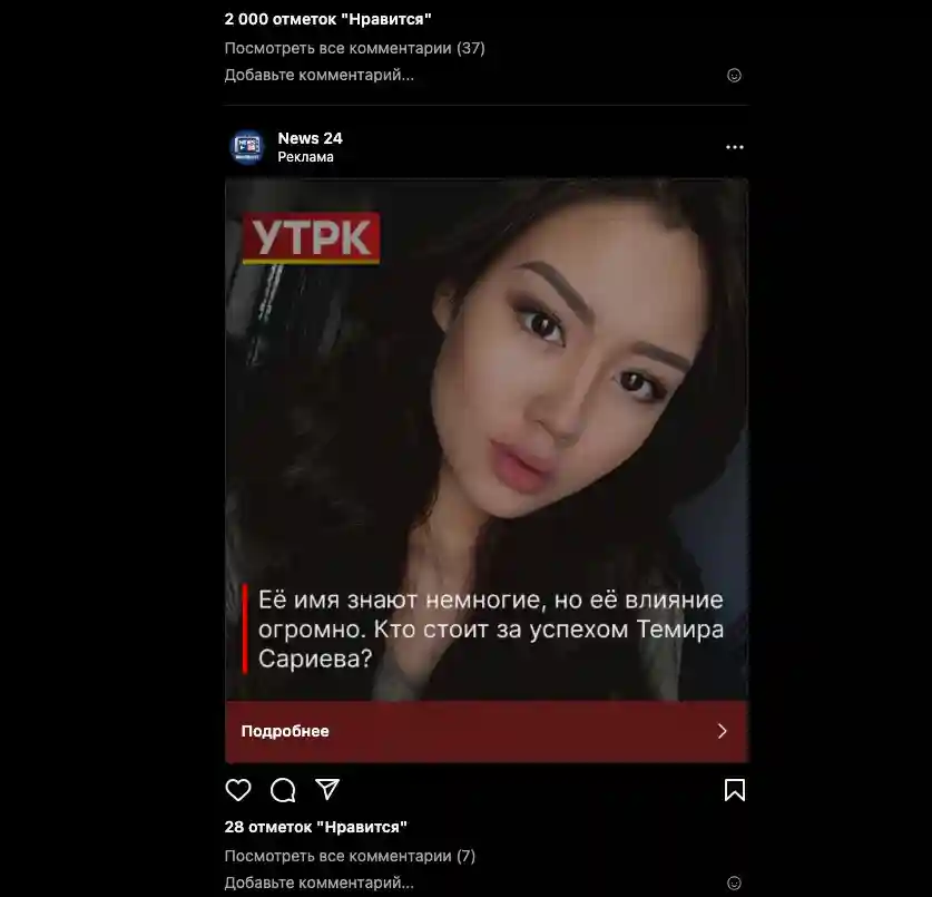 Кроме того, в Instagram появилась реклама с логотипом УТРК с заголовком «Ее знают немногие, но ее влияние огромно. Что стоит за успехом Темира Сариева?». При этом было предложено перейти по ссылке.