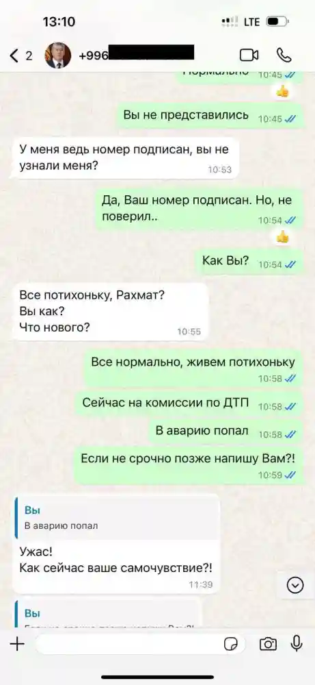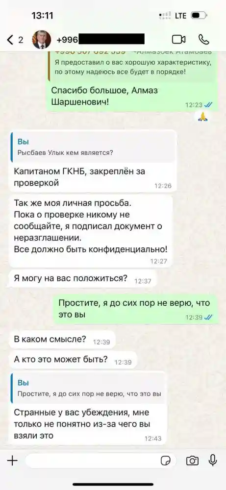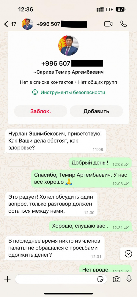 Интернет-мошенники использовали и имя главы Торгово-промышленной палаты Темира Сариева. От его имени партнеры и руководство палаты получили сообщения в WhatsApp с информацией о проверках и просьбах о предоставлении помощи проверяющим из ГКНБ.