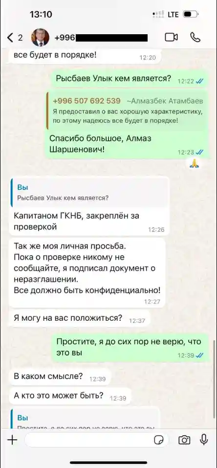 Лже-Атамбаев говорил о ГКНБ и проверке, о которой не стоит никому говорить. Адресат, которому пришло сообщение, не поверил, что ему пишет Атамбаев, и сообщил его сыну, поскольку до самого «Атамбаева» дозвониться не смог.