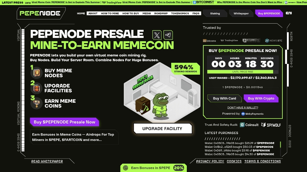 Особенность PepeNode в другом: он предлагает модель “mine-to-earn”, но полностью виртуальную. Не нужно покупать оборудование, вы собираете цифровые ноды и улучшения, которые формируют некий «виртуальный сервер». Награды начисляются смарт-контрактами, а геймификация сглаживает риск того, что пользователь просто забудет про токены. Это сочетание механики и эмоций, из-за которого проект и получил свое внимание на крипторынке.