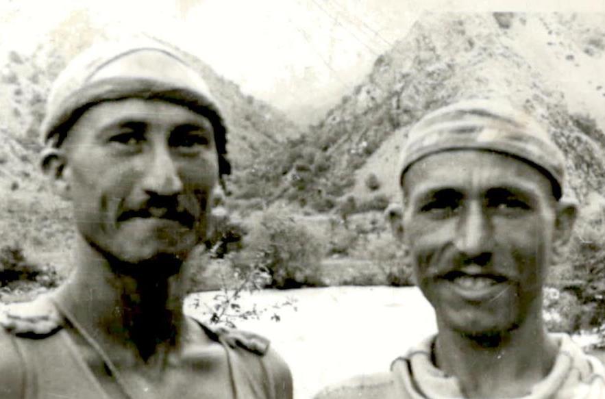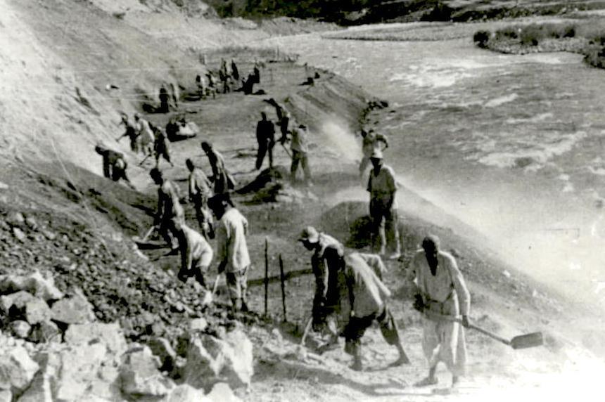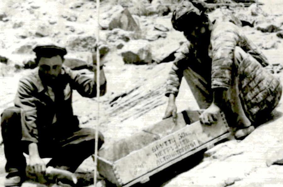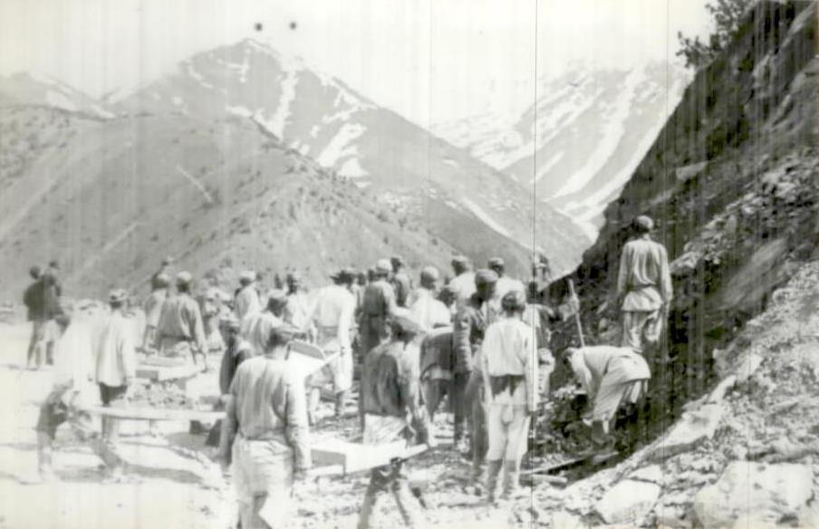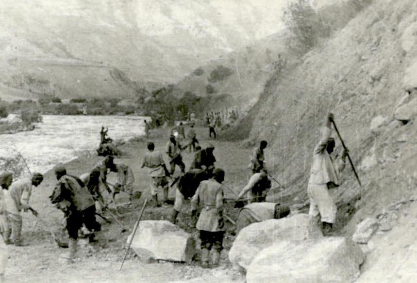 Бригада дорожных строителей приехавших из РСФСР выполняет разработку скальной породы на строительстве дороги Душанбе – Ташкент в районе перевала Анзоб, 1934 год. Фото предоставлено Гафуром Шерматовым