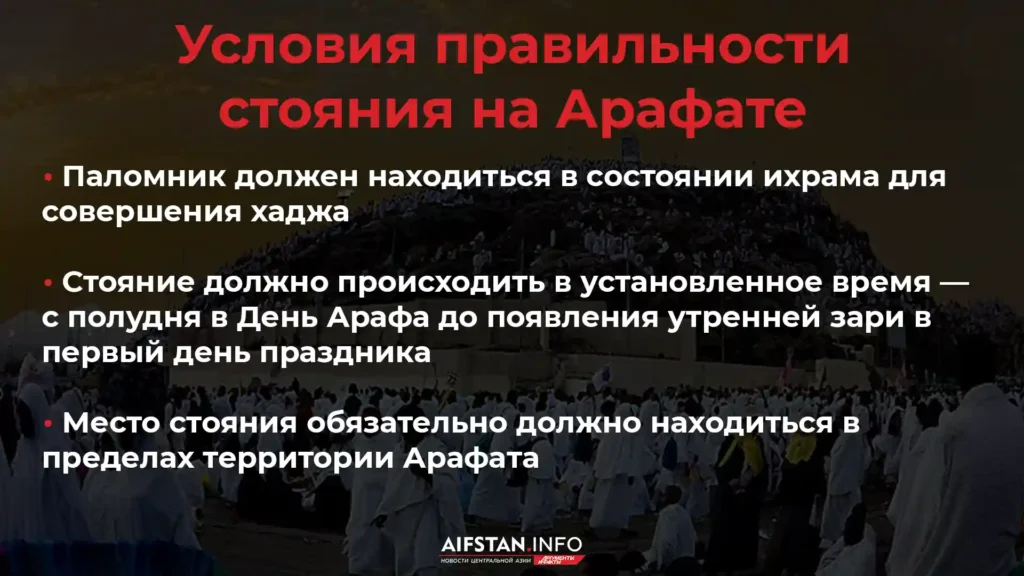 Стояние на Арафате является главным и обязательным элементом хаджа, о котором Пророк (с.а.в.) сказал: «Хадж — это Арафа». Если паломник выполнит все другие условия, но не совершит стояния на Арафате, его хадж будет считаться недействительным.