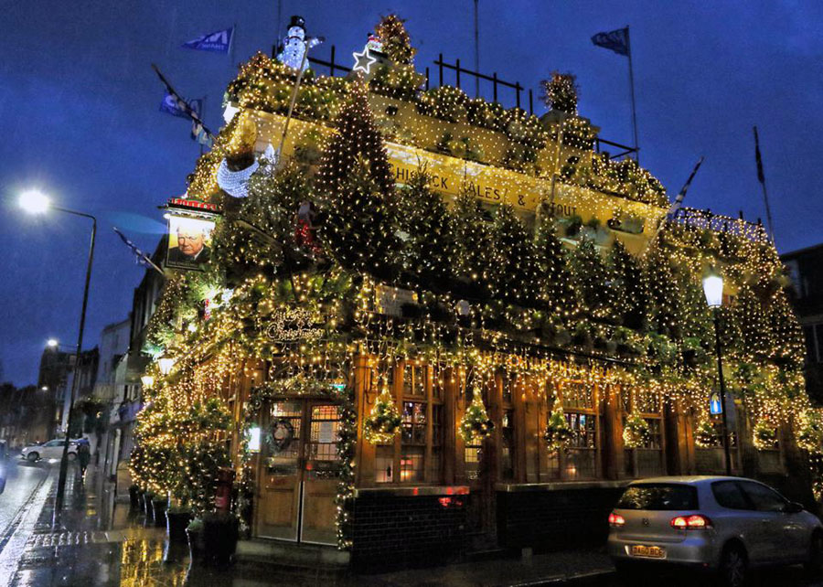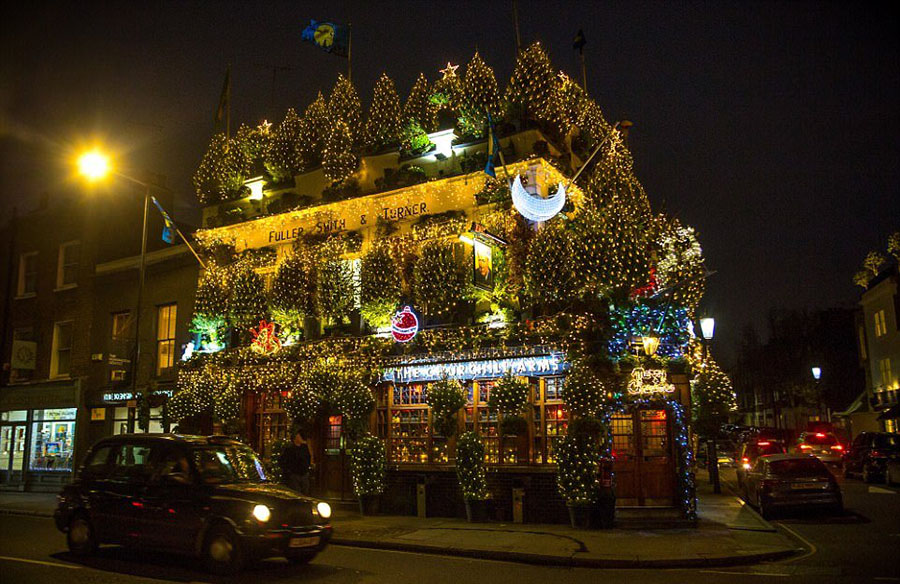 Если вы думаете, что в этом году переборщили с новогодними украшениями, то посмотрите на убранство лондонского паба The Churchill Arms. Уверены, что ваша праздничная обстановка не идет ни в какое сравнение с декором этого места, ставшего настоящей достопримечательностью Лондона. The Churchill Arms может по праву считаться самым праздничным баром в Великобритании. Его хозяева уже на протяжении 30 лет украшают паб сотней рождественских деревьев и 25 000 мерцающих огней. Остается только порадоваться, что за электричество платите не вы!