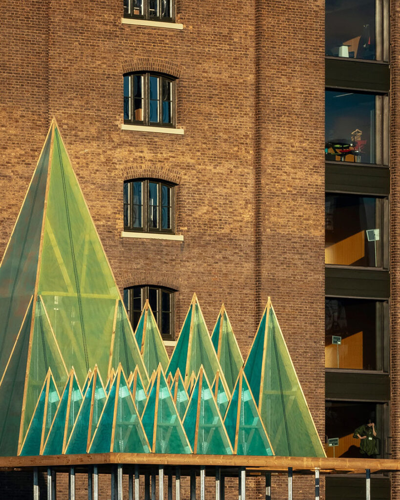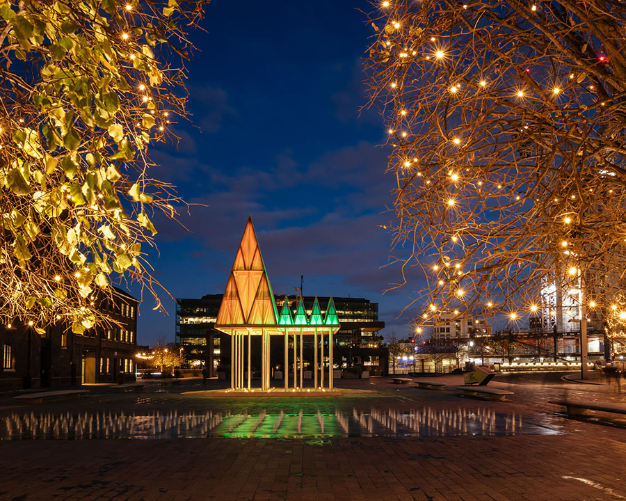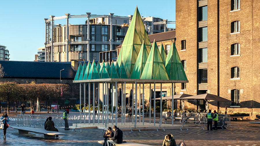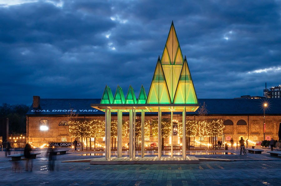 Студия Сэма Джейкоба создала электрическую инсталляцию Nemeton для площади King’s Cross в Лондоне. Высота арт-объекта — 11 метров. Он представляет собой композицию из зелёных пирамид, вдохновлённых кельтской мифологией и образами священных рощ Неметон. Такой дизайн предлагает футуристический взгляд на традиционную рождественскую ёлку, под которой можно прогуливаться, сохраняя социальную дистанцию.