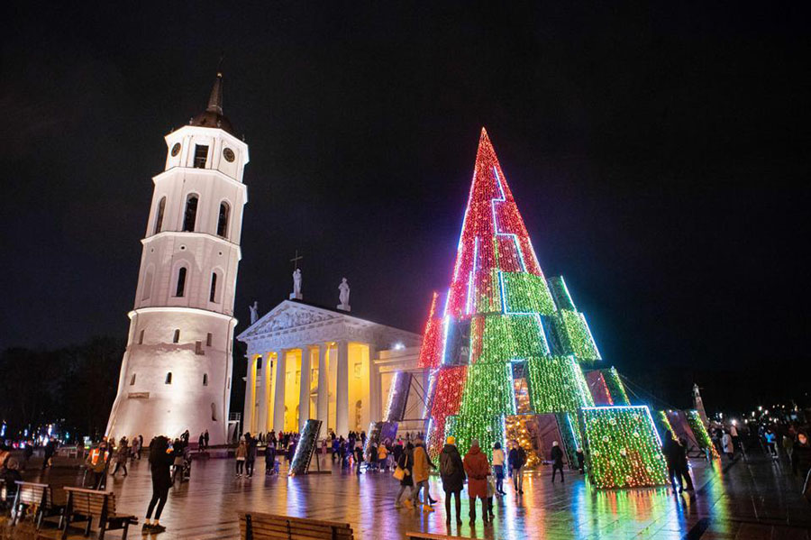 В народе композицию, расположившуюся на главной площади Вильнюса, прозвали елка-киберпанк.