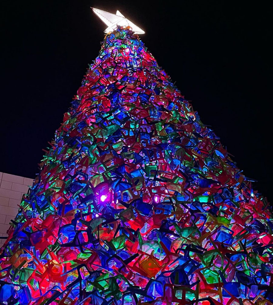 Одна из самых креативных ёлок в мире недавно появилась в мексиканском Монтеррее, около регионального музея Мичоакано. Художник Серхио Родригес создал арт-объект из 4 тысяч разноцветных детских пластиковых стульев. Эти стулья использовались в школах и детских садах, а теперь обрели вторую жизнь в качестве оригинальной рождественской ели.