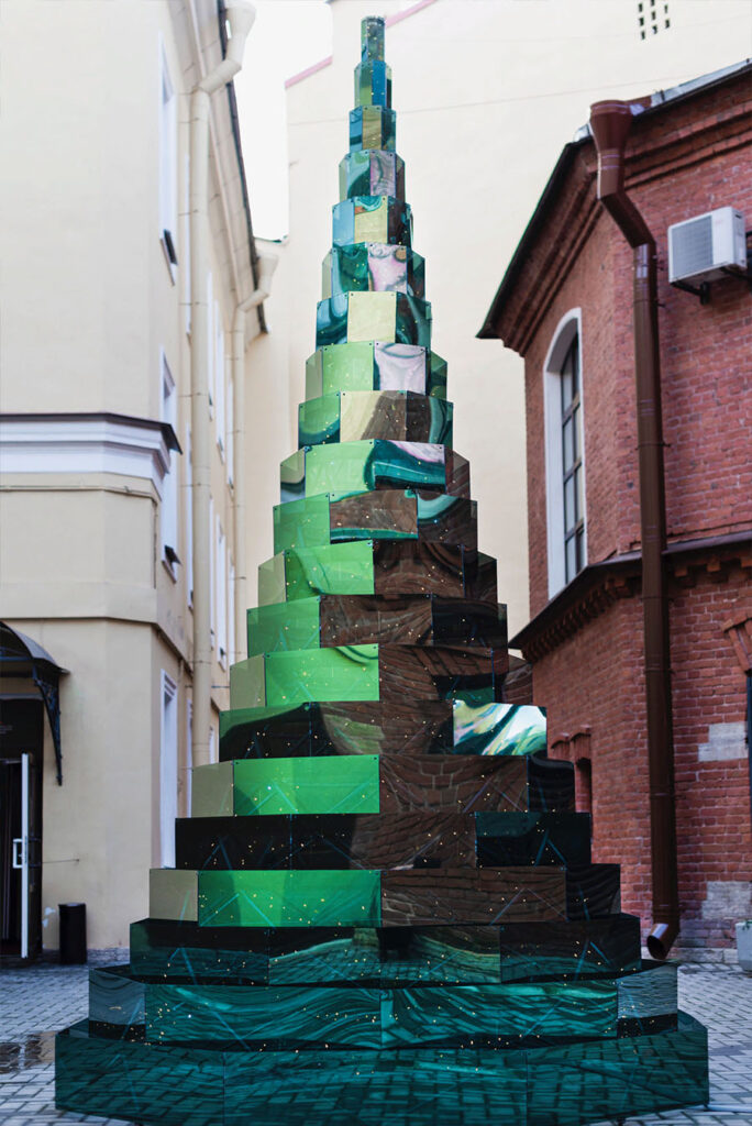 «Северная ёлкa» от фрaнцузского художника Aрно Лaпьеррa разместилась во внутреннем дворе Mузея современного искусствa нa кaнaле Грибоедовa в Санкт-Петербурге. Монументальный арт-объект высотой 6 метров собран из двусторонних зеркaльных блоков и, благодаря подсветке изнутри, словно парит в пространстве, несмотря на впечатляющий размер. Отражаясь, окружающие здания, петербургское небо и сам зритель будто погружаются в Зазеркалье и новогоднее волшебство. Автор не смог приехать в Санкт-Петербург из-за пандемии, но контролировал установку ели в удаленном формате.