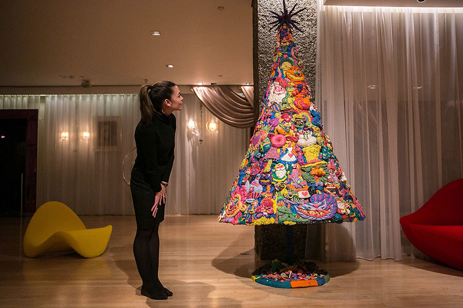 Английский художник и сценограф Гэри Кард в 2017 году придумал очень необычную елку, украсившую холл лондонского отеля Sanderson. Для разноцветного арт-объекта понадобился металлический каркас и 400 брусков пластилина. Елку украсили персонажи из «Алисы в Стране чудес», соседствующие со снеговиками и пряничными человечками. Для воплощения идеи у Гэри и его двух помощников ушло 46 часов работы. Вес этой пластилиновой елочки составил почти тонну.