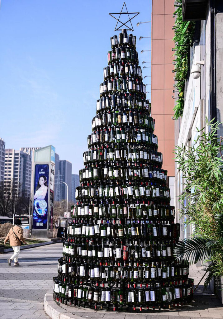 Поддержать дух праздника, сохранить елке жизнь и при этом помочь экологии решили в китайском Шаньяне, создав елку из винных бутылок. Арт-объект имеет высоту 10 метров и состоит из 2021 бутылки. Думаем, такая идея может стать очень вдохновляющей для владельцев ресторанов, баров или виноделен.
