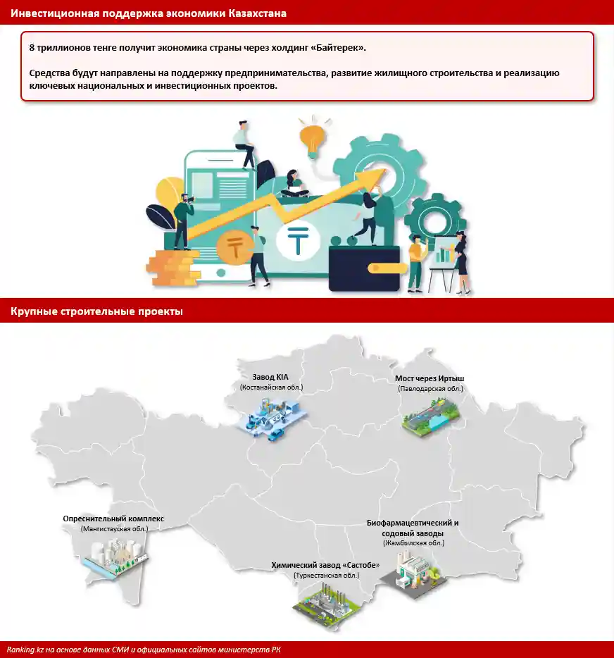 8 трлн тг — объём льготного финансирования через холдинг «Байтерек» в 2025 году (прибавит до 1,3 п. п. к росту ВВП). Средства идут на МСБ, жильё и национальные проекты.