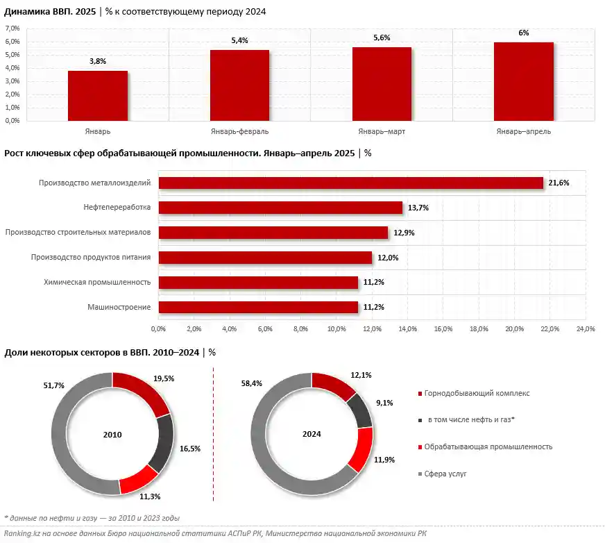 По данным Бюро национальной статистики, за январь—апрель 2025 года реальный ВВП Казахстана вырос на 6%.