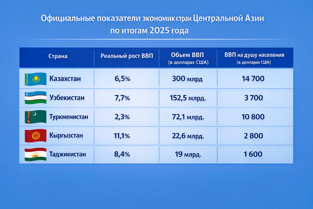 По Π΄Π°Π½Π½Ρ‹ΠΌ Π½Π°Ρ†ΠΈΠΎΠ½Π°Π»ΡŒΠ½Ρ‹Ρ… статистичСских вСдомств стран Ρ€Π΅Π³ΠΈΠΎΠ½Π° (ΠΏΠΎ ВуркмСнистану Π΄Π°Π½Π½Ρ‹Π΅ ΠœΠ’Π€), Π½Π°ΠΈΠ±ΠΎΠ»Π΅Π΅ высокий рост продСмонстрировала Π² 2025 Π³ΠΎΠ΄Ρƒ экономика ΠšΡ‹Ρ€Π³Ρ‹Π·ΡΡ‚Π°Π½Π° (11,1%), Π° самый скромный – экономика ВуркмСнистана (2,3%).Β