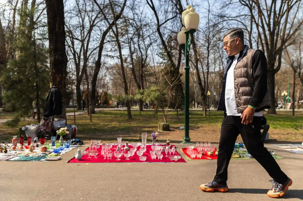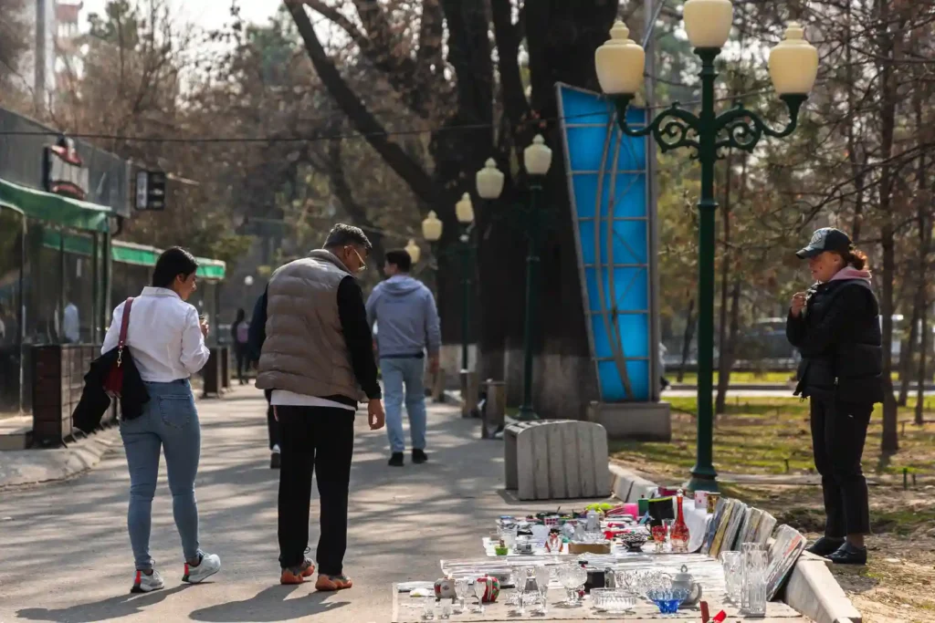 Прогулку по Ташкенту мы начинаем в двух шагах от Moti — на бульваре «Голубые купола», который Анвар Джураев называет «аллейкой». Здесь он иногда гуляет с товарищами, катает детей на семейном велосипеде, рассматривает безделушки у продавцов местной барахолки. Ими он не особо интересуется, но не отвлечься на вещицы трудно. Говорит, из старья его могут заинтересовать только музыкальные инструменты, потому что интересно, кто на них играл, какие сочинялись мелодии. На улице его часто узнают поклонники. Он общается с ними как с давними знакомыми, делает фото на память и вид, будто помнит, когда виделись в последний раз.