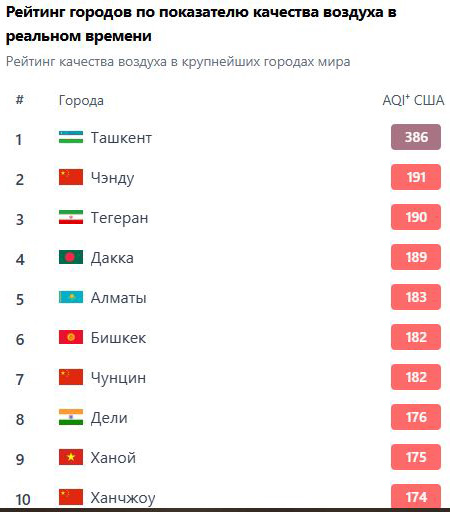 Бишкек вошёл в число шести городов мира с самым высоким уровнем загрязнения воздуха. Такие данные приводят международные платформы мониторинга качества воздуха, актуальные на 17:30.