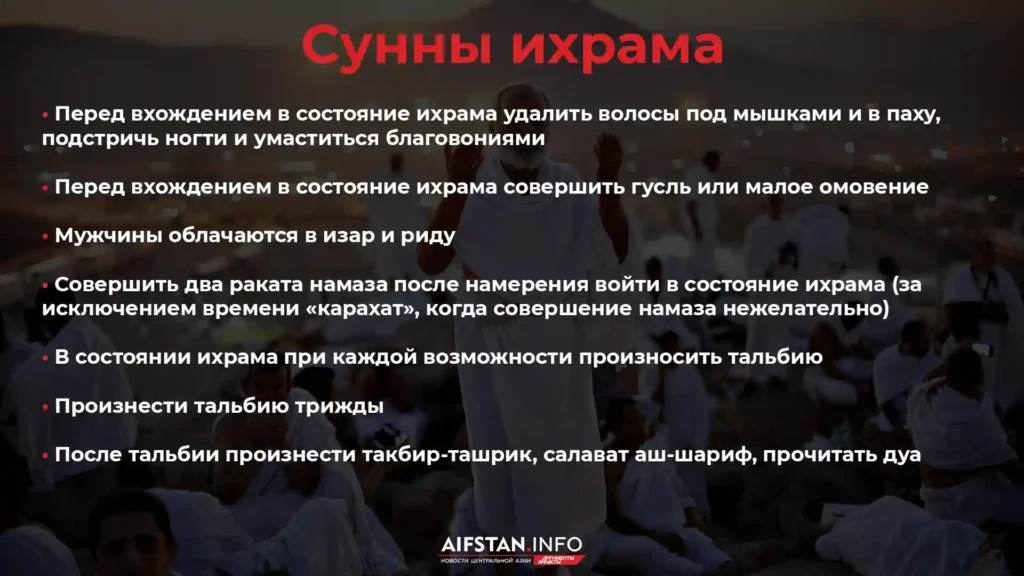 - Перед вхождением в состояние ихрама удалить волосы под мышками и в паху, подстричь ногти и умаститься благовониями