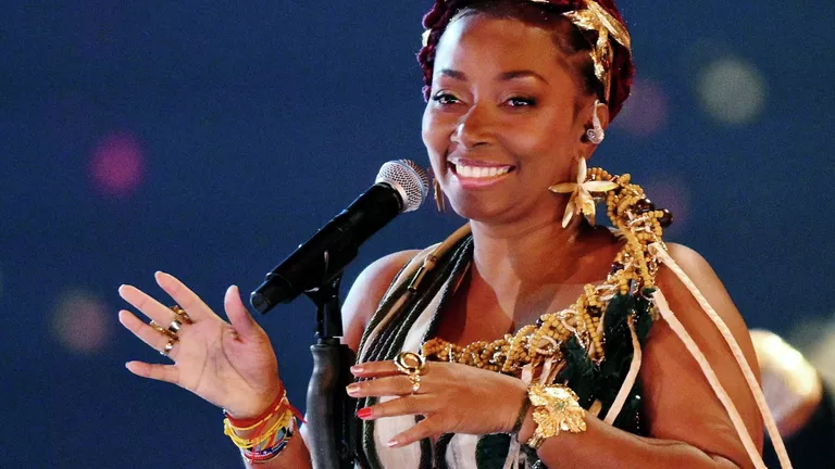 Санайпей Танде (Кения) выступает на международном музыкальном конкурсе «Интервидение» в Москве.