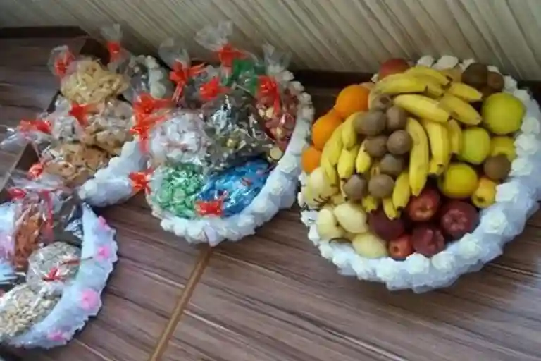 Кроме вышеперечисленного, нужно еще отнести кешик (угощение). В него входят сладости, примерно 10 кг конфет и столько же печенья, фрукты, спиртные напитки — 1-2 коробки. Обязательно боорсоки и сваренное мясо одного барана (без головы и кишок). Это примерная составляющая кешика, кстати, носят его друг другу обе стороны.