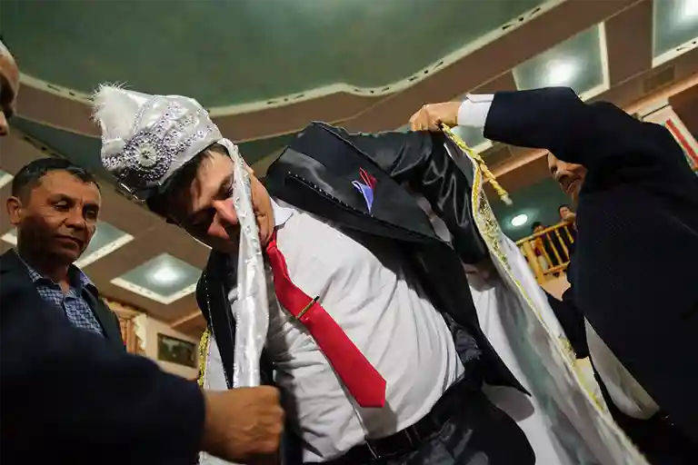 И тут есть два обряда, о которых нужно упомянуть. В какой-то момент, когда гости расселись по местам, жениха вызывают в середину зала, где проводят обряд «Жома-пушон» — одевание в халат. Один из старейшин рода читает молитву-благословение, после чего он или кто-то из родственников одевает жениха в нарядный золотошвейный халат, а на голову повязывает чалму. Это означает, что юноша с этого дня становится настоящим и полноценным мужчиной. После этого гости подходят обнимать и поздравлять жениха, одаривая подарками и деньгами. Праздник продолжается, а ещё через некоторое время в середину зала вызывают уже невесту. Теперь к ней выстраивается вереница из родственниц и подруг, которые целуют её и дарят подарки, в том числе золотые украшения. Называется эта церемония «Келин-курди» (буквально «увидеться с невестой»).