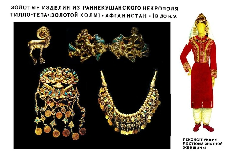 Образцами искусства ранне-кушанского периода служат золотые изделия, обнаруженные археологом В. Сарианиди на севере Афганистана на холме Тилло-тепа-Золотой холм, подтверждая существование местной бактрийской высокохудожественной школы обработки металлов в сако-скифском стиле, с еще заметными эллинскими элементами.