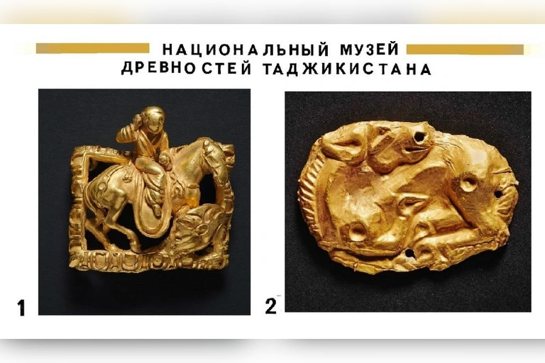 При раскопках храма Тахти Сангин была обнаружена золотая пластина с инкрустацией с изображением человека ведущего верблюда, вероятно, являющаяся частью какого-то сложного украшения.