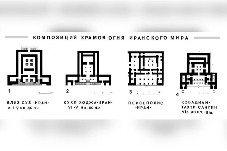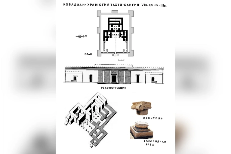 Объемно-пространственное и композиционное решение храма на основании известных образцов, раскопанных ранее в Иране позволяет отнести Тахти Сангин, как хронологически, так и типологически к древнеиранским храмам-огня VI -III вв. до н.э.: в Кухи Ходжа, Персеполисе и в Сузах.