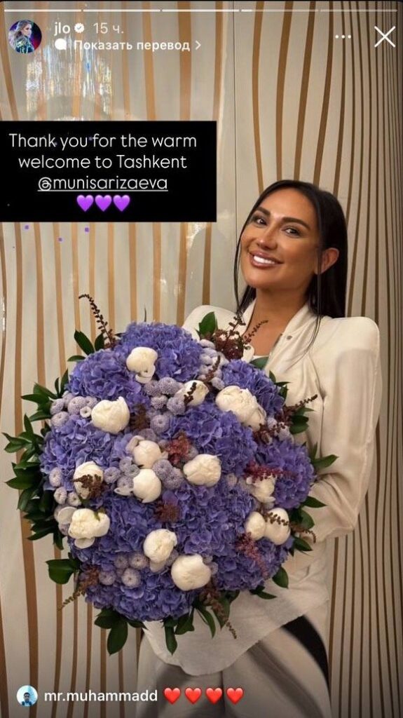 Свой визит в Узбекистан звезда отработала добросовестнее: в преддверии концерта ей вручили ляган с её портретом, видео распаковки которого пошло в Instagram. Также певица поблагодарила узбекскую публику, опубликовав фотографию с артисткой Мунисой Ризаевой, преподносящей ей букет. Кроме того, сообщалось о вручении персонального подарочного набора от организаторов. В одном из видеороликов Лопес, одетая в спортивный костюм, показала интерьер зала с традиционными угощениями и видом на город.