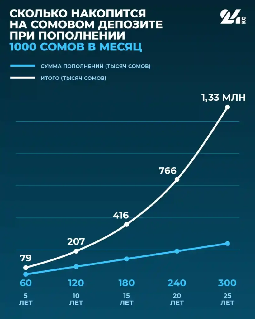 Конечно, чем раньше начать откладывать, тем лучше. Магия сбережений начинает работать со временем, то есть чем дольше срок — тем быстрее прирастает капитал. Например, если вы открыли банковский депозит под 11 процентов годовых с капитализацией процентов раз в год на 1000 сомов и пополняете его по 1000 сомов один раз в месяц, то через 5 лет вы соберете 79 тысяч, через 10 лет — 207 тысяч, а через 25 лет это будет уже почти 1,4 миллиона сомов. Сумма, отложенная вами, составит 300 тысяч сомов, а процент к ним превысит 1 миллион сомов. Чем выше срок накоплений, тем эффективнее работают ваши сбережения.