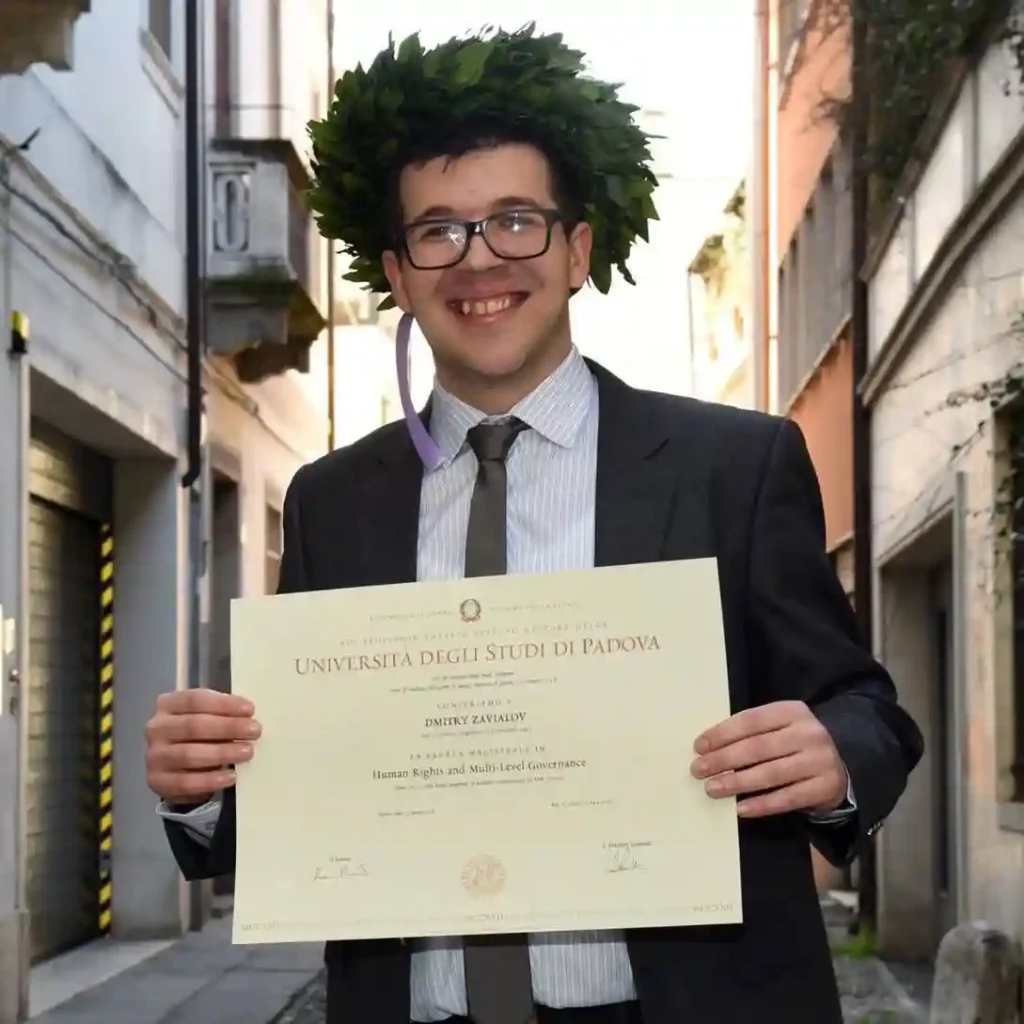 Диплом с отличием открыл ему путь в Европу. Дмитрий поступил в Университет Падуи в Италии, где изучал права человека и многоуровневое управление. Туда он поступил по стипендии Erasmus Mundus. Его магистерская диссертация была посвящена защите прав беженцев в разных регионах мира.