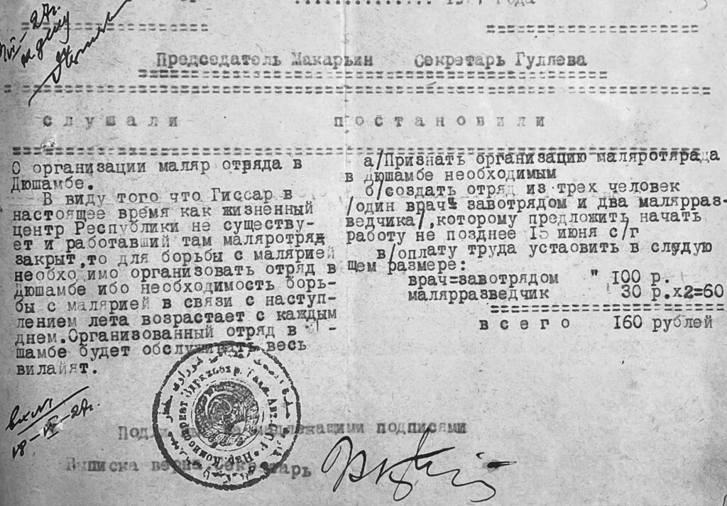 Π’ 1927 Π³ΠΎΠ΄Ρƒ Π² Π”ΡŽΡˆΠ°ΠΌΠ±Π΅ Π±Ρ‹Π» создан малярийный отряд, ΠΏΠΎΠ·ΠΆΠ΅ β€” рСспубликанская малярийная станция, Π° с 1928 Π³ΠΎΠ΄Π° Π½Π°Ρ‡Π°Π» Ρ€Π°Π±ΠΎΡ‚Ρƒ Π½Π°ΡƒΡ‡Π½ΠΎβ€‘ΠΈΡΡΠ»Π΅Π΄ΠΎΠ²Π°Ρ‚Π΅Π»ΡŒΡΠΊΠΈΠΉ тропичСский институт. Однако Π² ΠΏΠ΅Ρ€Π²Ρ‹Π΅ Π³ΠΎΠ΄Ρ‹ ΡƒΡ‡Ρ€Π΅ΠΆΠ΄Π΅Π½ΠΈΠ΅ испытывало ΠΎΡΡ‚Ρ€ΡƒΡŽ Π½Π΅Ρ…Π²Π°Ρ‚ΠΊΡƒ спСциалистов‑маляриологов ΠΈ оборудования. ΠŸΠΎΠ΄Π΄Π΅Ρ€ΠΆΠΊΠ° ΠΏΡ€ΠΈΡˆΠ»Π° ΠΈΠ· ΠœΠΎΡΠΊΠ²Ρ‹.