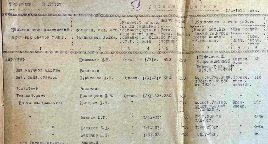 Π¨Ρ‚Π°Ρ‚Π½ΠΎΠ΅ расписаниС ВропичСского института (Π˜Π½ΡΡ‚ΠΈΡ‚ΡƒΡ‚ малярии ΠΈ мСдицинской ΠΏΠ°Ρ€Π°Π·ΠΈΡ‚ΠΎΠ»ΠΎΠ³ΠΈΠΈ). ВадТикская Π‘Π‘Π , Π‘Ρ‚Π°Π»ΠΈΠ½Π°Π±Π°Π΄, 1935 Π³ΠΎΠ΄. Π€ΠΎΡ‚ΠΎ ΠΈΠ· Π°Ρ€Ρ…ΠΈΠ²Π° Π“. Π¨Π΅Ρ€ΠΌΠ°Ρ‚ΠΎΠ²Π°