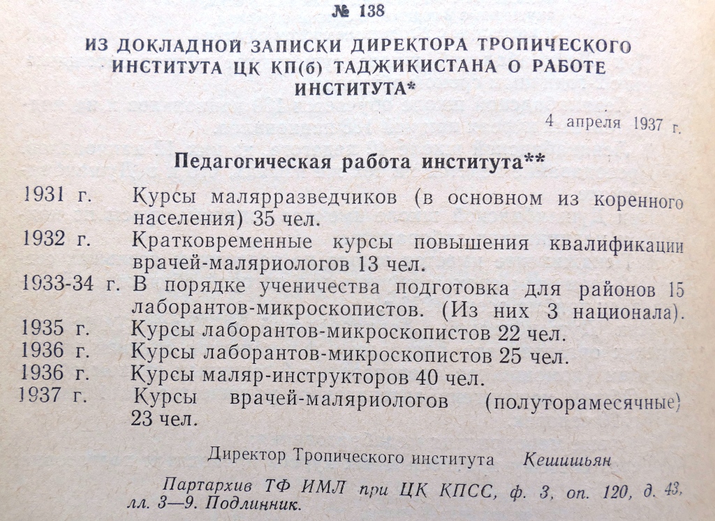 Π’ Π¦Π΅Π½Ρ‚Ρ€Π°Π»ΡŒΠ½ΠΎΠΌ тропичСском институтС срочно ΠΎΡ€Π³Π°Π½ΠΈΠ·ΠΎΠ²Π°Π»ΠΈ двухмСсячныС курсы для Π²Ρ€Π°Ρ‡Π΅ΠΉ, Π³ΠΎΡ‚ΠΎΠ²Ρ‹Ρ… ΠΏΠΎΠ΅Ρ…Π°Ρ‚ΡŒ Ρ€Π°Π±ΠΎΡ‚Π°Ρ‚ΡŒ Π² ВадТикистан. На 15 мСст ΠΏΠΎΠ΄Π°Π»ΠΈ 150 заявлСний. И ΡƒΠΆΠ΅ с июля 1931 Π³ΠΎΠ΄Π° Π˜Π½ΡΡ‚ΠΈΡ‚ΡƒΡ‚ малярии ΠΈ мСдицинской ΠΏΠ°Ρ€Π°Π·ΠΈΡ‚ΠΎΠ»ΠΎΠ³ΠΈΠΈ Π½Π°Ρ‡Π°Π» ΠΏΠΎΠ»Π½ΠΎΡ†Π΅Π½Π½ΡƒΡŽ Ρ€Π°Π±ΠΎΡ‚Ρƒ.