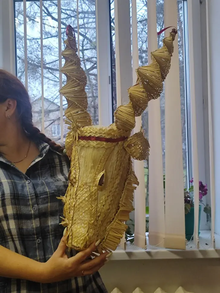 Например, эту маску козы надевают на Рождественское Колядование – распространенная традиция среди белорусов и русских. В Беларуси принято козу водить в Колядки, и ее должны накормить. Если не накормят, она будет лежать и плакать. Коза, в целом, в Беларуси – к благополучию в доме.