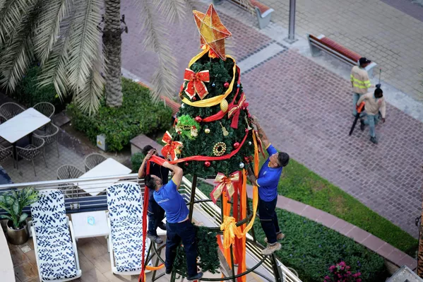 Рабочие украшают рождественскую елку в Дубае, ОАЭ.