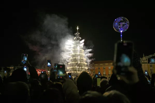 Зажжение огней на рождественской елке в Лиссабоне, Португалия.