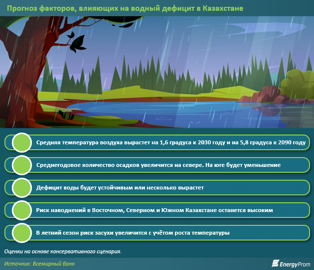 «Речной сток в Казахстане за последние годы сократился почти на 27%. В этом виноваты не только изменение климата, но и, в первую очередь, сокращение притока трансграничных рек, текущих с территорий соседних государств. Водные ресурсы в РК подвергаются и многим другим рискам: неэффективному использованию в сельском хозяйстве, загрязнению, износу инфраструктуры и недостаточному уровню инвестиций. Все это может больно ударить не только по социальной стороне развития, но и в целом по экономике страны. Теперь воду нужно рассматривать не только как ресурс для обеспечения водоснабжения, сельского хозяйства, промышленности, но и как потенциальный сдерживающий фактор для развития. Поэтому, если в ближайшие годы не предпринять мер, дефицит может ударить по дальнейшему экономическому развитию страны», — отмечают международные эксперты.