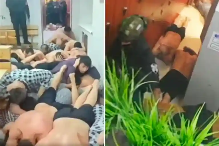 На кадрах видно, как сотрудники силовых структур в балаклавах и с красными повязками на руках применяют физическую силу к мужчинам, заставляя их лежать лицом вниз, ползти или передвигаться на коленях по полу, а также ходят по лежащим людям.