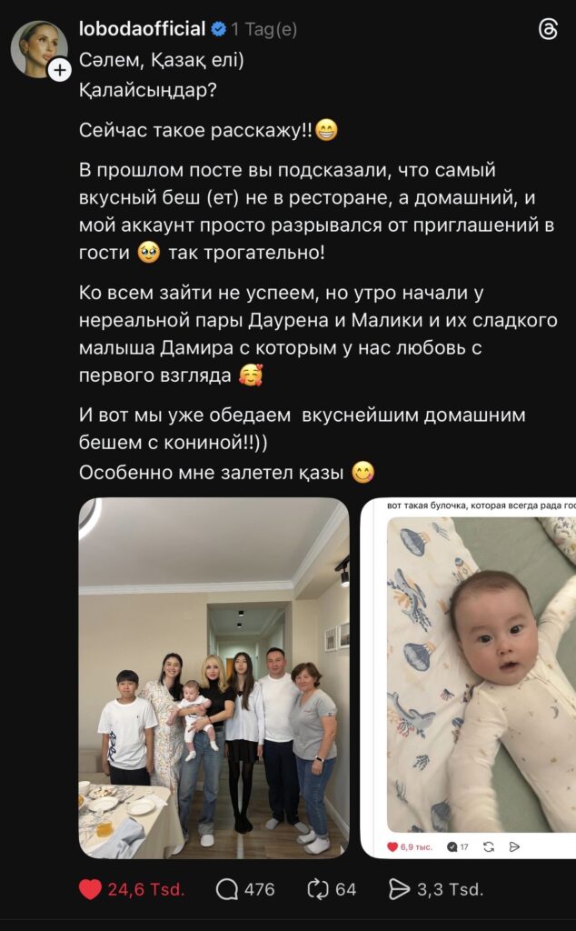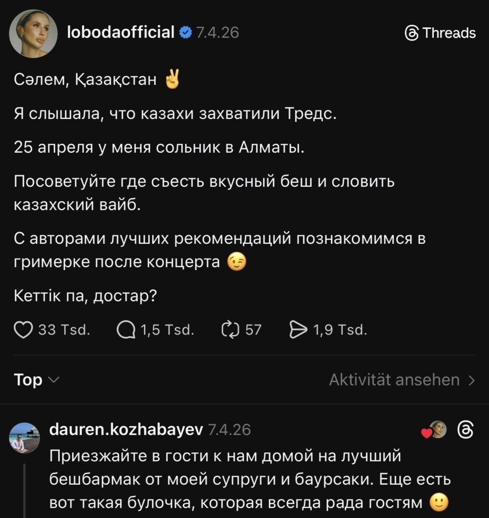 Началось всё с того, что Лобода опубликовала в Threads новость о своём сольном концерте в Алматы и заодно спросила у казахстанцев, где можно попробовать самый вкусный бешбармак.