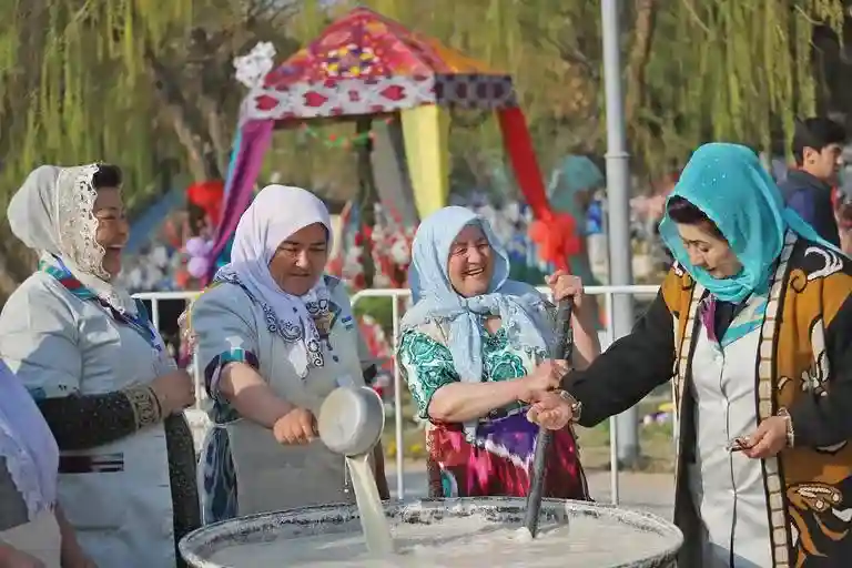 В Узбекистане праздничный стол украшают продуктами, символизирующими возрождение и новую жизнь. Например, кроме традиционных блюд со злаками, готовят кук-самсу, кук-манты, кук-чучвару — с обязательной начинкой из свежей зелени. Ну и куда же плова, шурпы, мяса и яиц, окрашенных в зеленый цвет (цвет весны).