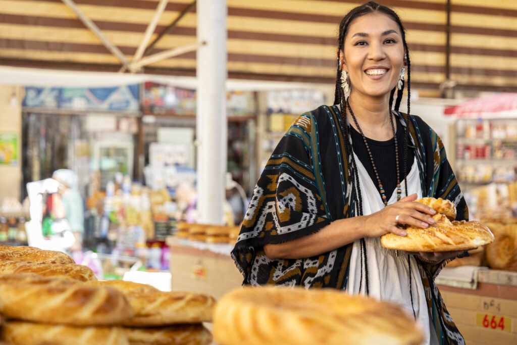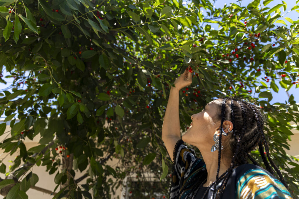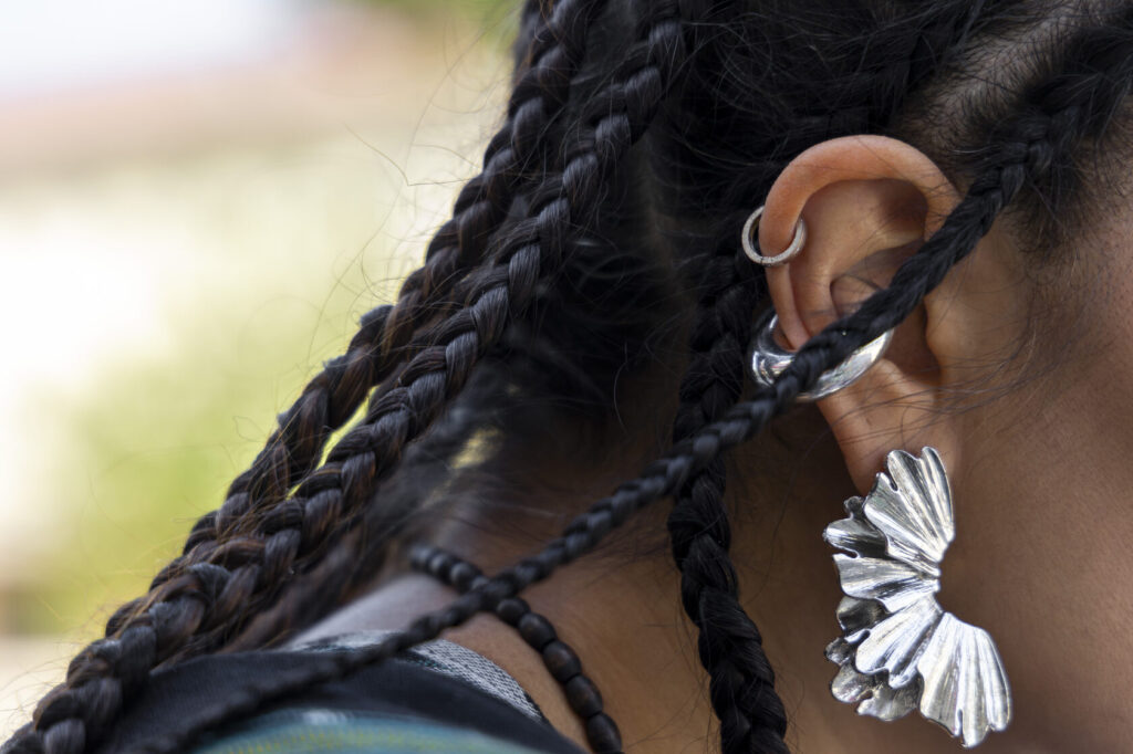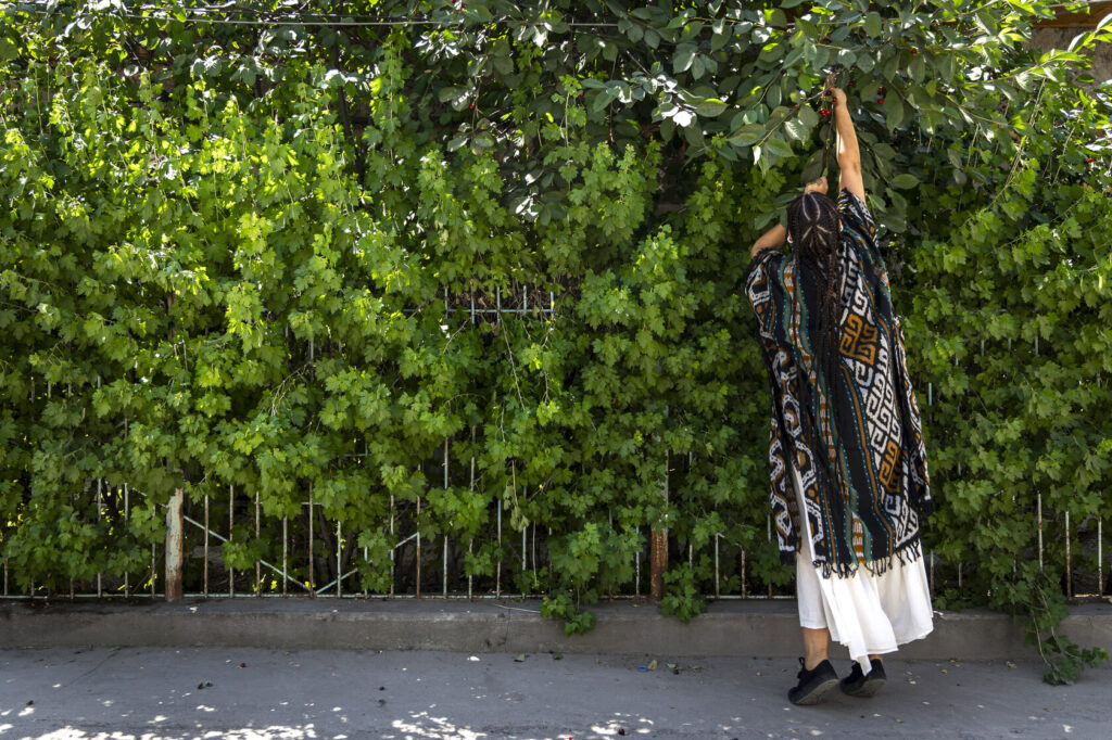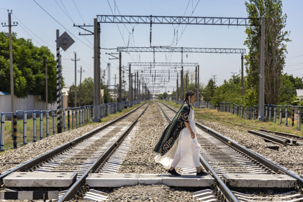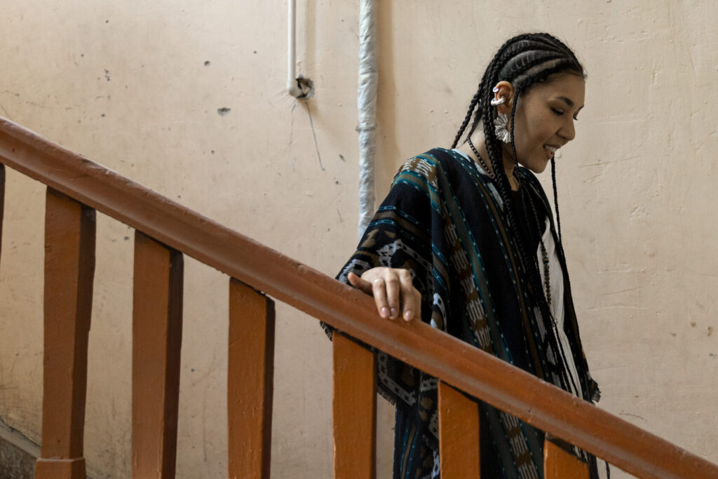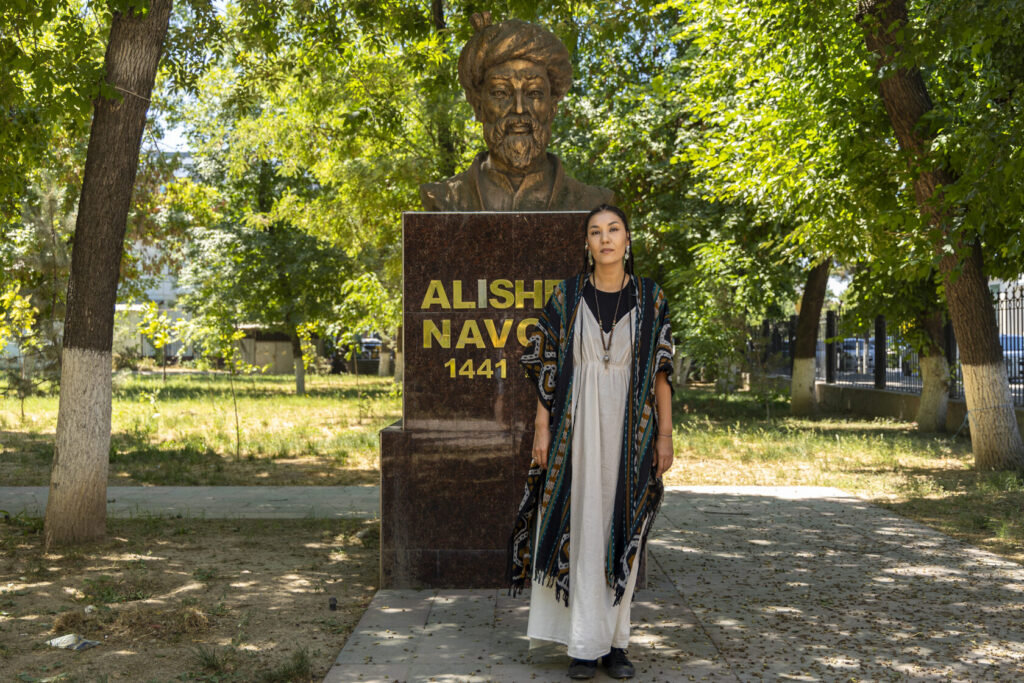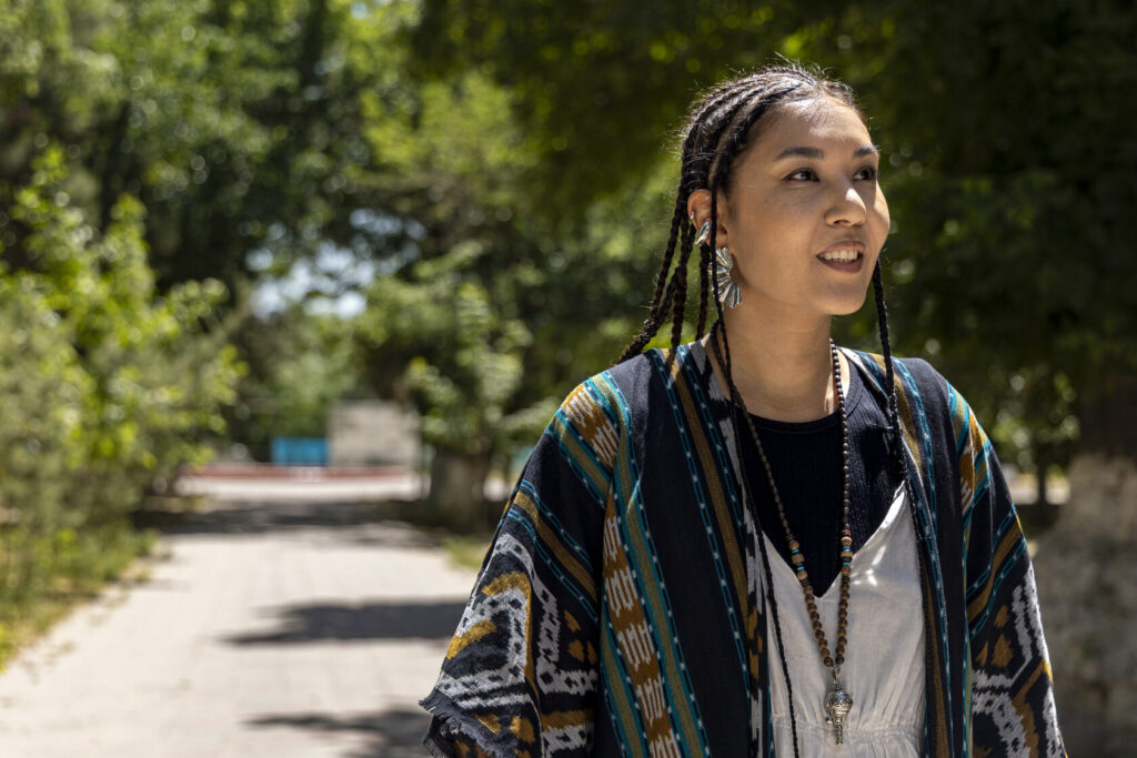 Сайёра рассказывает с особым ритмом: тщательно подбирая слова, словно перебирая чётки — синоним за синонимом, пока не найдёт нужный. Это внимательное отношение к деталям угадывается и в её внешности: белое хлопковое платье, кимоно в балийском стиле, серебро в украшениях и почти сорок тонких кос. Несмотря на восточные черты, образ Мусаевой вызывает ассоциации не столько с традиционным узбекским стилем, сколько с глобальной культурой нью-эйдж.