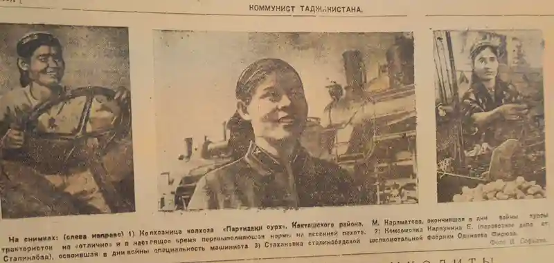 Женщины Таджикистана внесли огромный вклад в победу в Великой Отечественной войне. Более половины работников промышленных предприятий республики были женщины, а в сельском хозяйстве их доля достигала 80%.