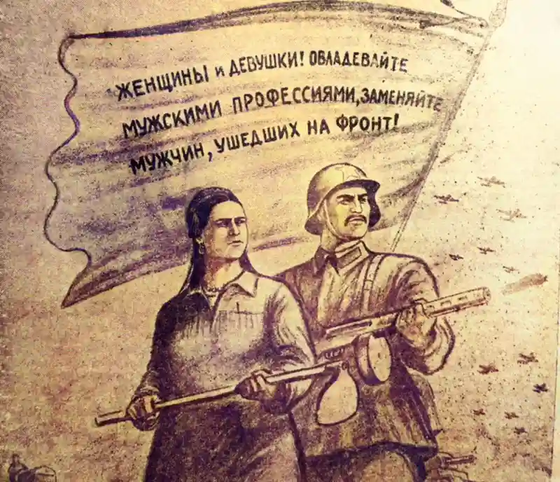 «Женщины! На производство, на самолеты, на тракторы, комбайны и автомобили!… Свободная советская женщина не может быть равнодушной, когда весь мир охвачен гневом и ненавистью к фашистским бандитам».